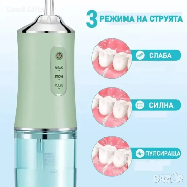 Портативен зъбен душ с 3 режима на действие – слаб, среден и силен и ултра тънка, но мощна водна струя за перфектно почистване на междузъбното пространство.