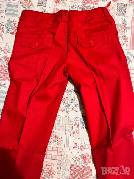 Червен дамски панталон, памук, с предни джобове, задните са декоративни. Ниска талия, прав крачол.