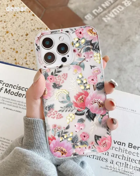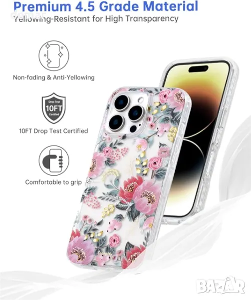SCORPIFY Калъф за iPhone 16 Pro Max, сладко прозрачно покритие с цветя и златни акценти за жени