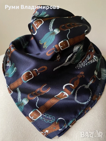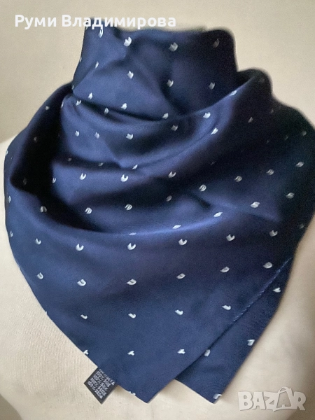 Тъмносиня кърпа за глава от 100 % коприна от две парчета копринен плат, зашити отвътре, с десен на букви, размер 63 Х 65 см, отлично състояние, доставка с Еконт.