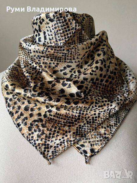 Малък, бежов шал/ кърпа за глава с леопардов и змийски принт, малък квадрат 48 X 52 см, без етикети, лъскава, сатенирана материя, състояние нов. Доставка с Еконт!