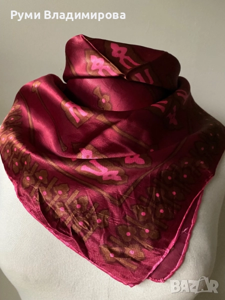 кърпа за глава, шал, с графични елементи в розово и тютюнево, размери 66 Х 67 см, сатенирана материя, без етикет, според мен изкуствена, ефектна, винтидж, отлично състояние, доставка с Еконт.