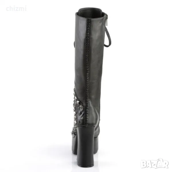 Платформа с високи токчета, висок ботуш, до коляното с връзки, с шипове и метален паяк на палеца, пълно вътрешно затваряне с цип, черна веганска кожа / черна, 4 1/2 "(114 мм) блок пета, 2" (51 мм) платформа.