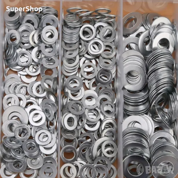 Комплект от 900 бр. метални шайби в удобна кутия за съхранение.