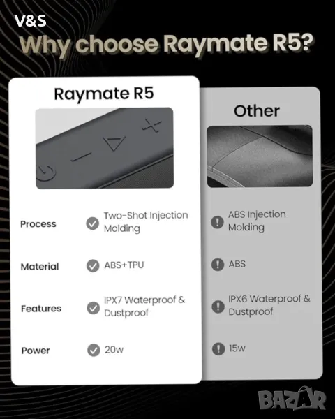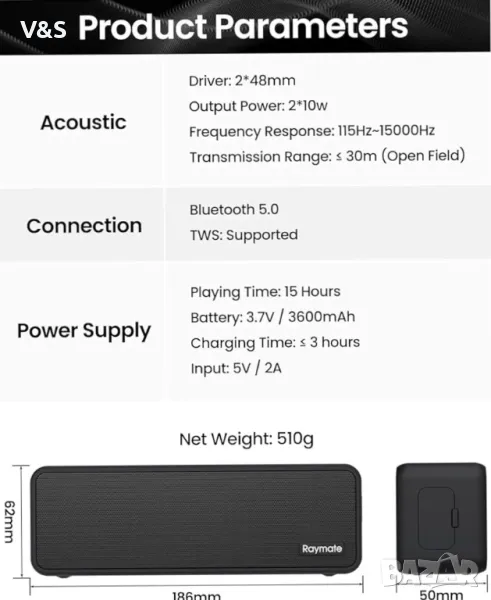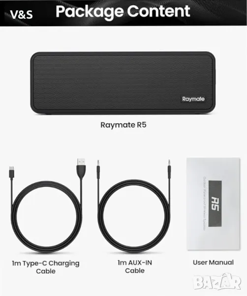 Bluetooth колонка Raymate, 20W IPX7 водоустойчив високоговорител, безжичен Bluetooth-V5.0,