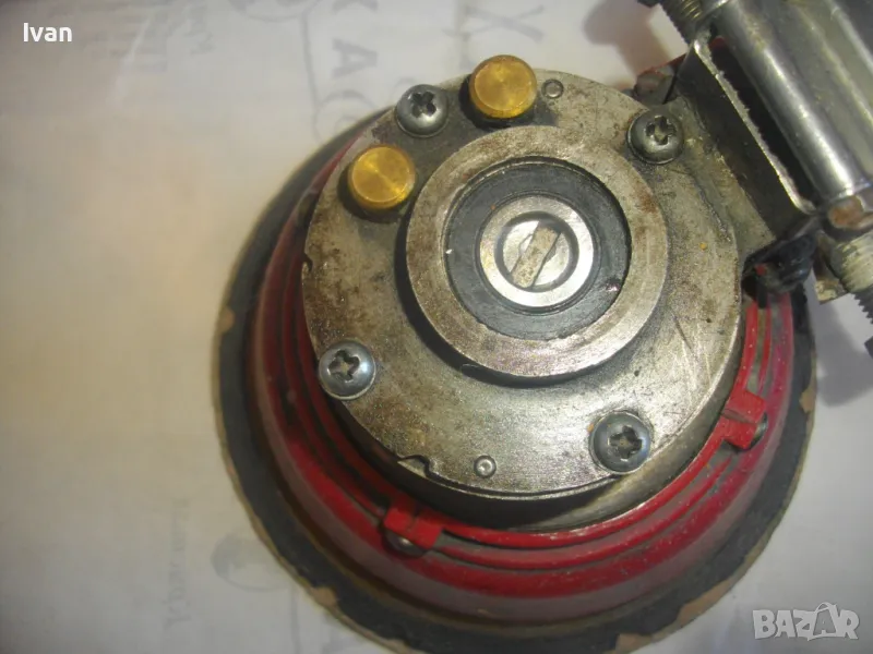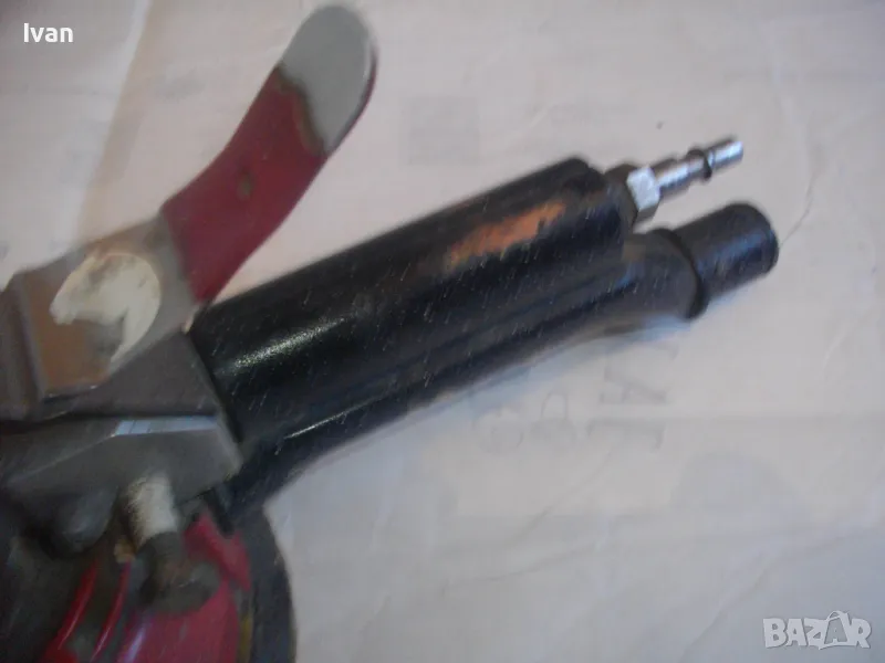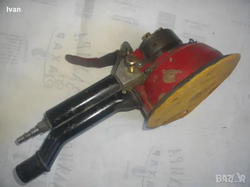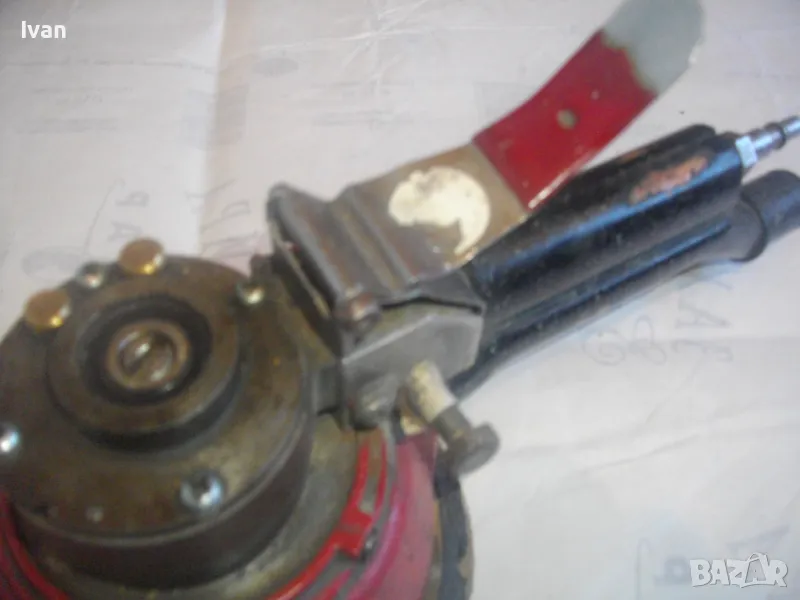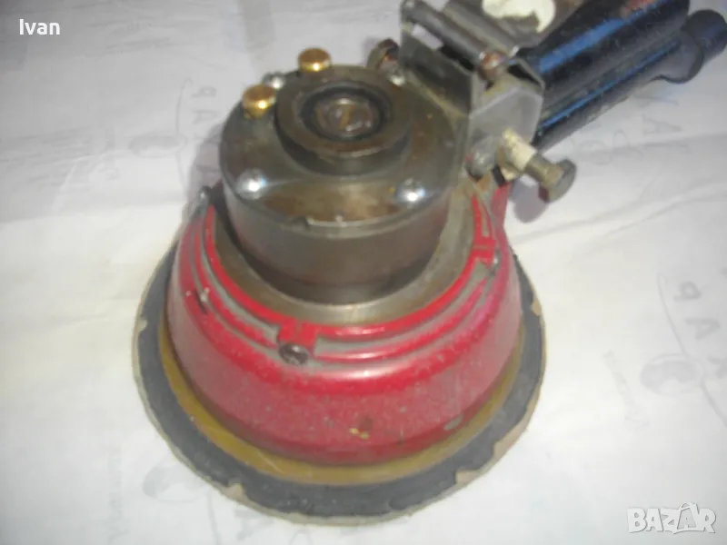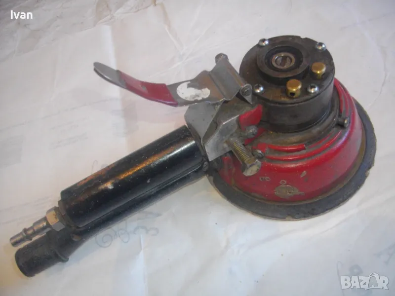 ОПИСАНИЕ на пневматичен голям професионален кръгъл 150 мм червен ексцентър виброшлайф . Отлично работно, механично състояние. Без забележки. Добри ротации и вибрации. За шкурки ф 150 мм. Плочата е с иносено велкро и шкурките се лепят. Масувин корпус, масивна ротационна глава, голям дълъг и удобен горен спусък на машината. Оригинален дълъг прахоуловител на задната част на корпуса за скачване с маркуч на строителна прахосмукачка. Бакелит прахоуловител. Бакелит покритие на дръжката на машината. Поставен оригинален щуцер бърза връзка за скачване с маркуч на компресор. Липсва фабричния стикер на машината. Предполагам, марката е FLEX, тъй като беше сред машини само от тази профи марка. Масивен модел от старото качество. Тегло - 2,2 кг. Дължина с конектора на отпадъчна прах 295 мм, височина със спусъка 150 мм. Ширина при главата плоча 150 мм. Поставена шкурка за проба и тест.