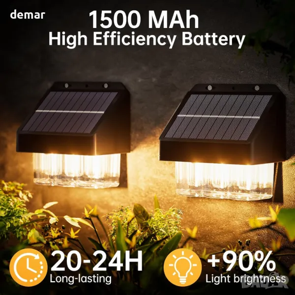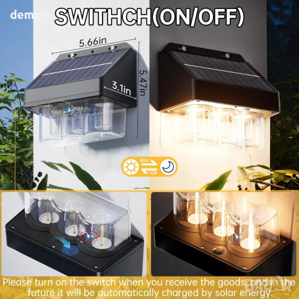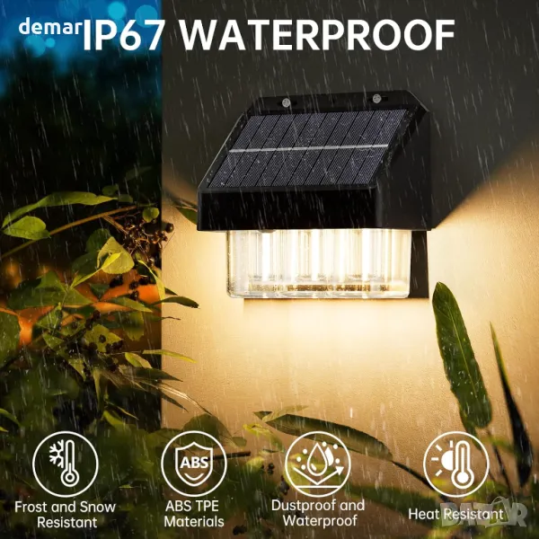 Външната соларна стенна лампа включва три LED волфрамови крушки, които излъчват топла бяла светлина (2700-3000K), подобрявайки атмосферата на градини, огради и стени. Изработен от високоякостна PCTG, ABS и TPE пластмаса, той може да се похвали с издръжливост и елегантен външен вид, с IP67 водоустойчив рейтинг, който издържа на сурови климатични условия. Ефективният дизайн на соларния панел позволява бързо зареждане, осигурявайки 12-24 часа осветление след само 6-8 часа слънчева светлина. Инсталирането е лесно и бързо с предоставените аксесоари за монтаж, което го прави универсален за декоративно или околно осветление на вътрешни дворове, палуби, басейни, стълби и веранди.