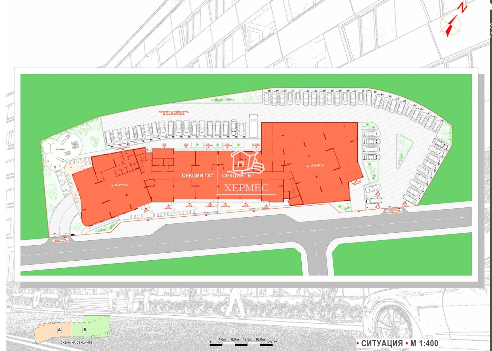 🚗Сградата разполага с подземен гараж за 49 автомобила, също и 56 паркоместа в двора.
