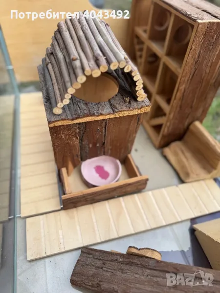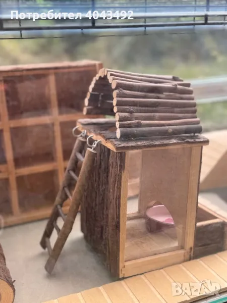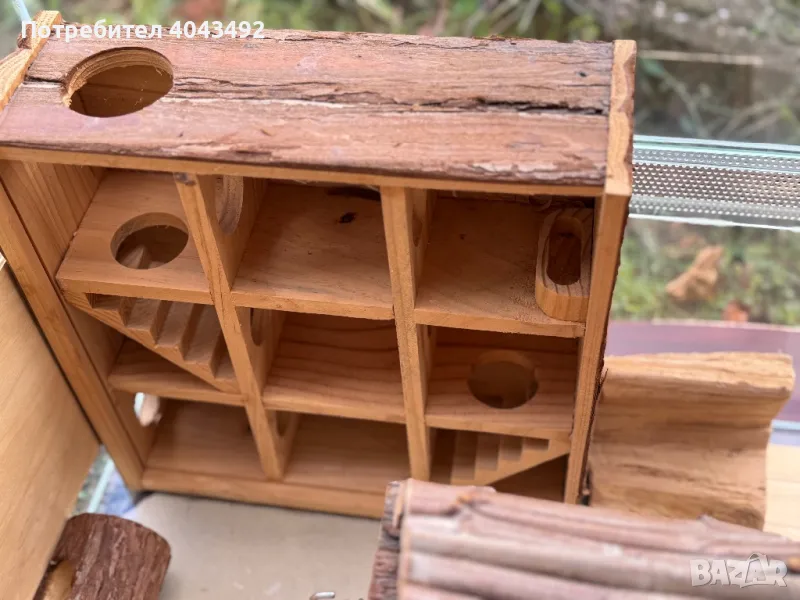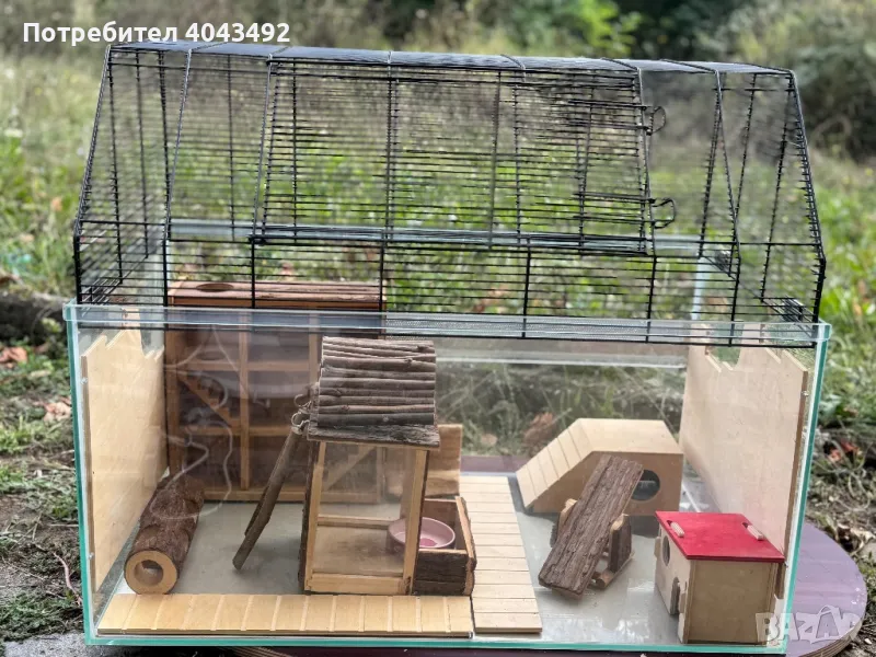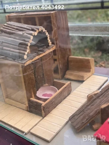 Голяма клетка стъклена с дървени ръчно направени приспособления за забавление на гризачите.