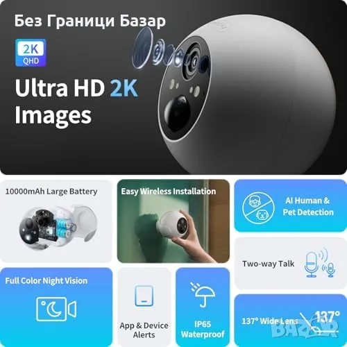 Нова 2K външна камера за сигурност, водоустойчива, 10000mAh батерия, AI