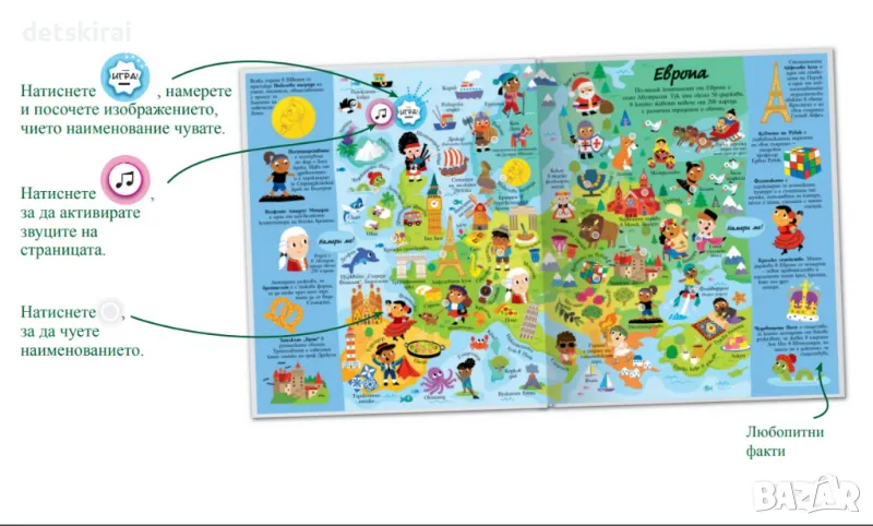 Книгата дава първа представа за континентите и за характерни техни забележителности. 200 звука оживяват многобройните забавни цветни илюстрации, превръщат децата в истински откриватели и им помагат да опознаят нашата планета.