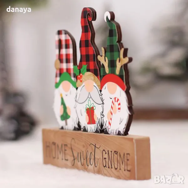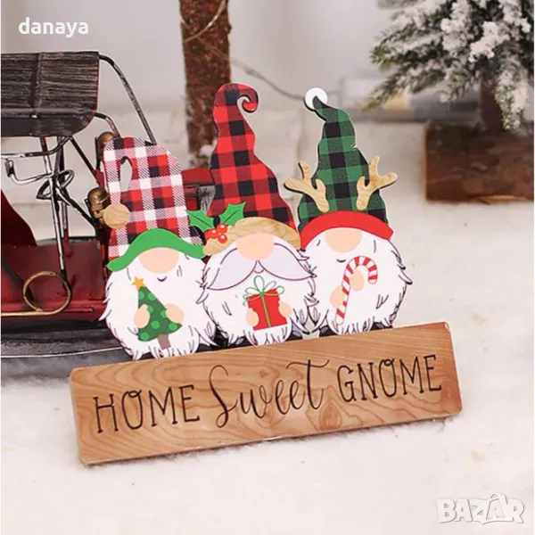 коледна украса с 3 гномчета. Тази красива стояща табела с надпис “Home Sweet Gnome” е идеалният акцент за вашия празничен коледен декор. С размери 15×15.5 см и изработена от MDF, тя е здрава и дълготрайна.