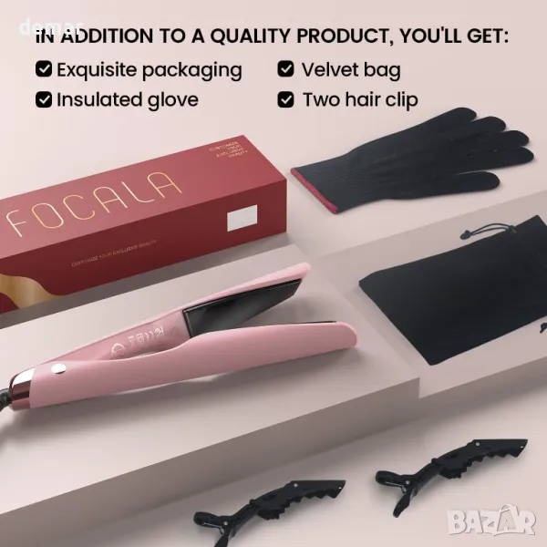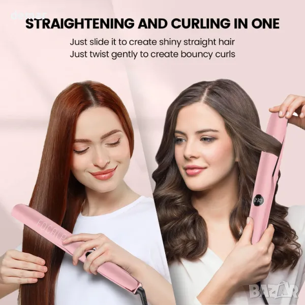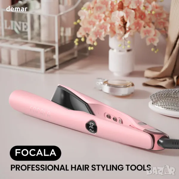 Преса за коса и маша FOCALA 2 в 1, уникален извит дизайн, 2,5 см, розова