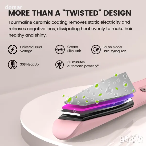 Този универсален инструмент за оформяне съчетава преса и маша, включващ уникална нагревателна плоча за усукване за лесно изправяне на косата или създаване на вълни. Неговото турмалиново керамично покритие премахва къдренето, като същевременно подобрява блясъка и здравето на косата чрез освобождаване на отрицателни йони. 3D плаващият дизайн със заоблени ръбове осигурява плавно плъзгане, което го отличава от традиционните инструменти. С бързо 30-секундно нагряване и 12 регулируеми температурни настройки до 232°С можете да постигнете резултати с качество на салона у дома. В допълнение, възможността за двойно напрежение (100-240V) го прави удобен за пътуване, докато 60-минутната функция за автоматично изключване и въртящият се на 360° опашен кабел подобряват безопасността и използваемостта.
