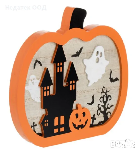 Декорация за маса дървена 2D тиква за Хелоуин с кула, призраци и прилепи.