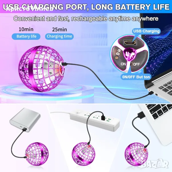 Летящата лед сфера може да се използва, както на светло, така и на тъмно. Ефектните й светлини ще разчупят всяка обстановка, а различните траектории на полета и маневри с високи скорости могат да се получат, като я хвърляте с различна скорост и под различен ъгъл. Зареждането на летящата лед топка става с помощта на USB кабел за 20-25 мин. и издържа около 6-8 мин. на постоянна работа. Можете да си играете с тази сфера на открито или на закрито.