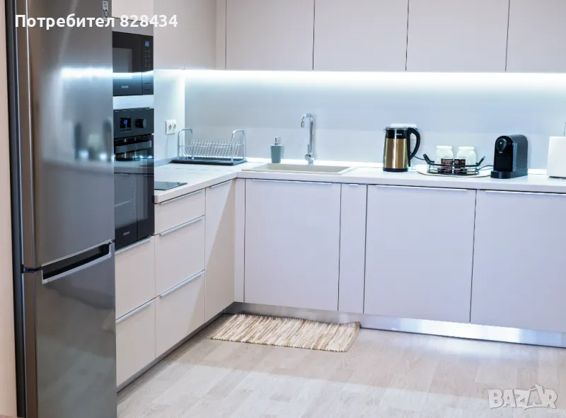 Кухнята е напълно оборудвана със съдомиялна машина, фурна, хладилник, микровълнова фурна, кафемашина, кана за гореща вода, прибори за хранене, съдове, в които може да си приготвите или стоплите храна, както и чаши и чинии - всичко необходимо за вашето приятно прекарване.