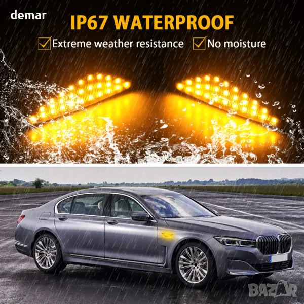 Този продукт е съвместим с BMW модели X3 F25 (2011-2017), X5 E70 (2007-2013) и X6 E71/E72 (2008-2014), с OEM номер 63137171008. Притежава множество сертификати (E9, CE, ECE, DOT, SAE) за правна безопасност на пътя. Светодиодният мигач с висока яркост осигурява ясна видимост с ниска консумация на енергия, насърчавайки енергийната ефективност и дълголетието. Неговите динамични кехлибарени жълти светлини, разположени зад димно черна леща, подобряват външния вид на автомобила, като същевременно подобряват видимостта на сигнала. Проектиран за лесна инсталация, той е готов за plug-and-play и canbus, като трансформира стандартните сигнали в привличащи вниманието динамични последователни мигачи. В допълнение, той може да се похвали с водоустойчив рейтинг IP67 за надеждна работа при мокри условия.