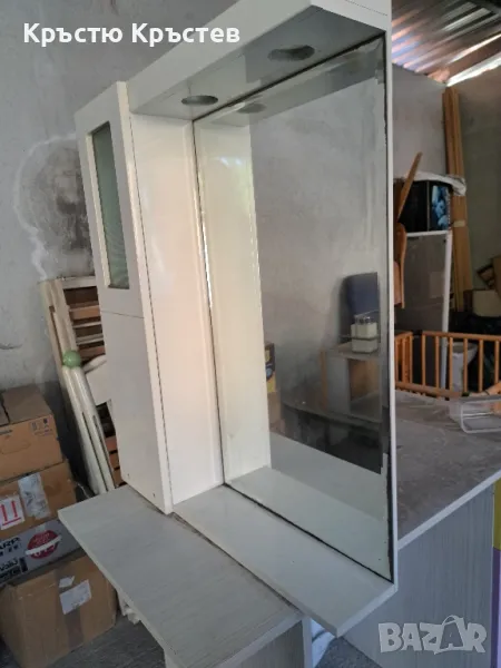 Шкафа е бял гланц в добро състояние.огледалото е със дредно дефекти по края,влязла е влага и е нарушила плаката.може да се смени