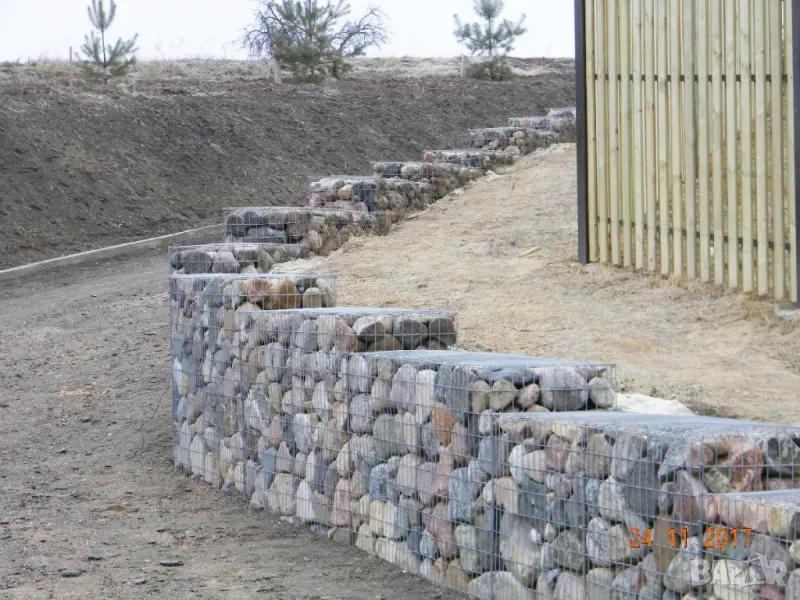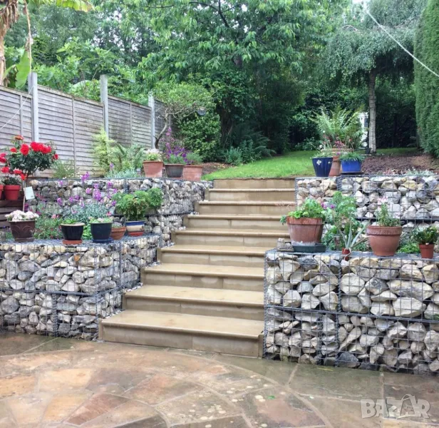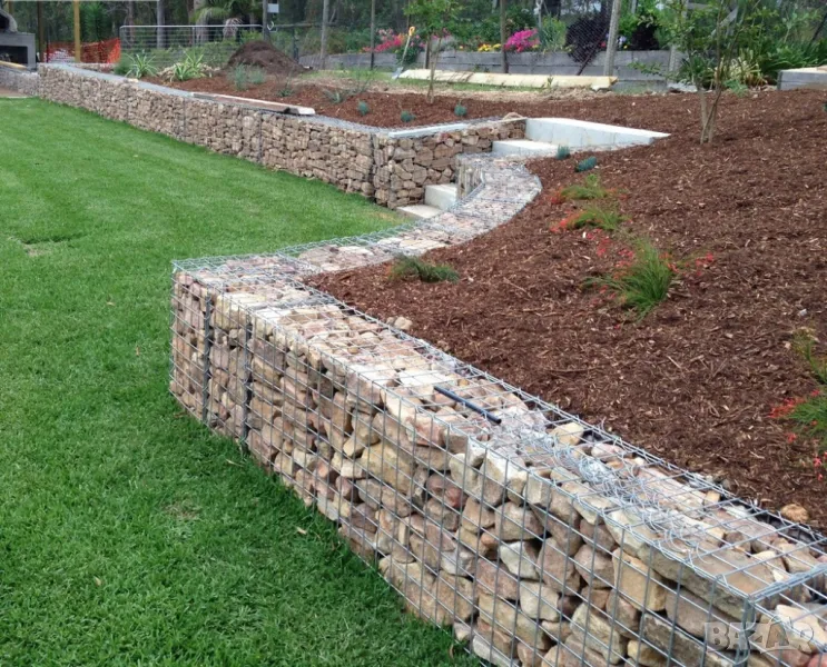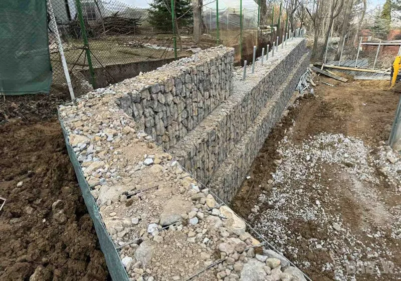 Габионът е нещо като голяма кошница, изработена от решетки, която се запълва с камъни. Лесно се монтират и са евтин заместител на стени от бетон..