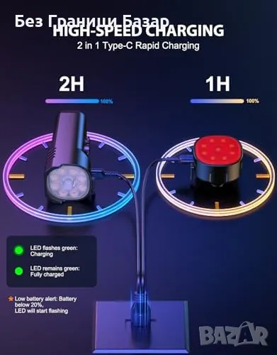 Бързо USB Зареждане: Зареждане за 2 часа (предна светлина) и 1 час (задна светлина) с USB-C кабел.
