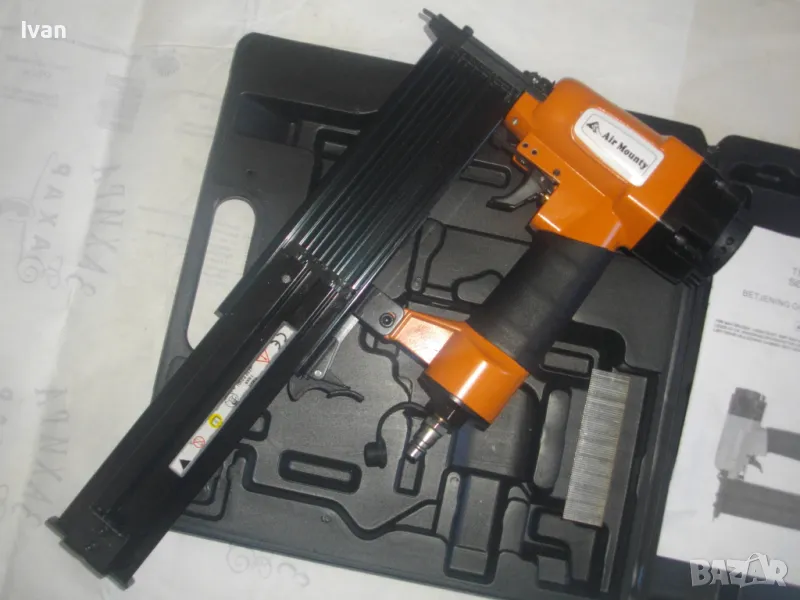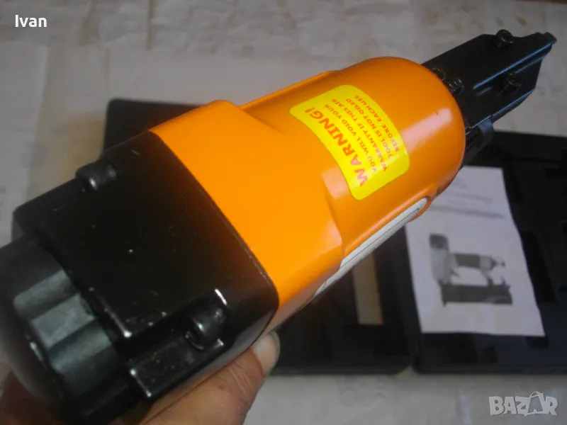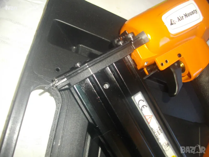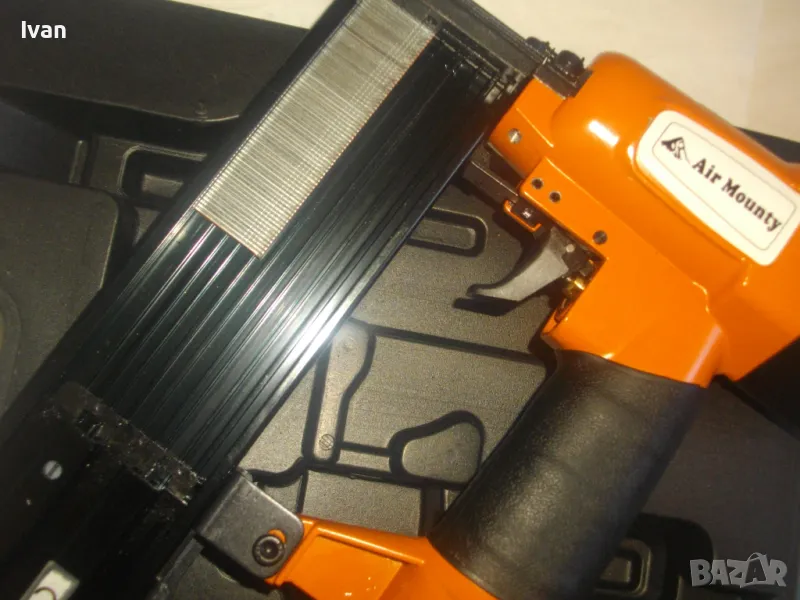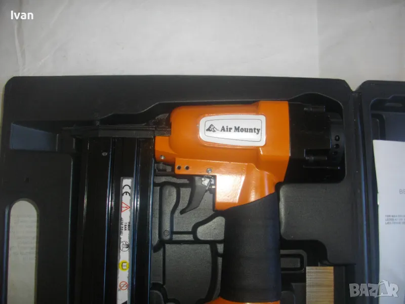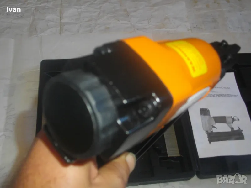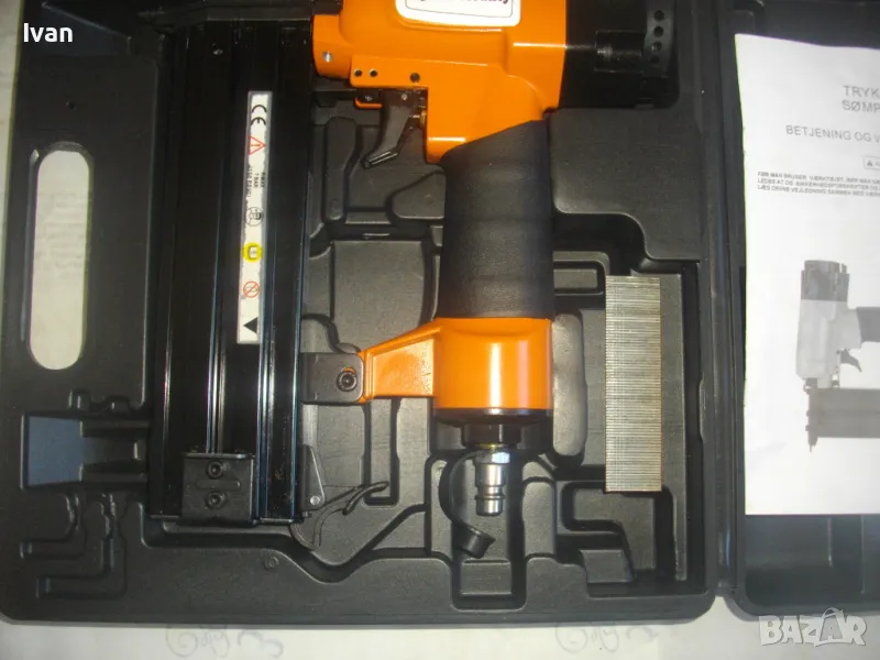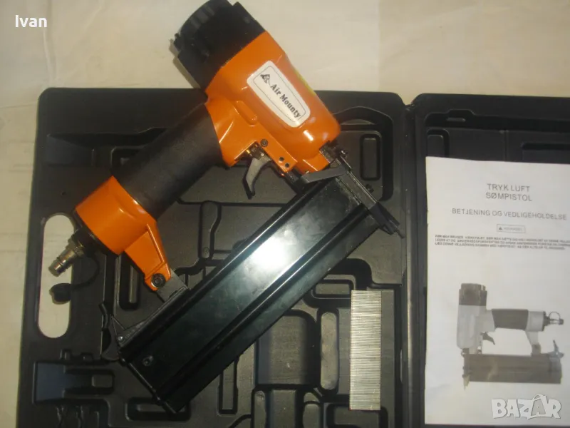 ОПИСАНИЕ оранжев пневматичен дърводелски тапицерски такер Air MOUNTY F 50. Немски оригинален, съвсем нов, неизползван и неупотребяван. Само за консумативи пирони с дължина до 50 мм. Масивен металн корпус с гумирано покритие на дръжката. Размери 230 х 250 х 50 мм. Регулация сила удар. Оригинална листовка. Оригинален пластмасов куфар. Блистер пирони за проба и тест. Тегло само на такера - 1,8 кг, тегло с куфара - 2,5 кг.