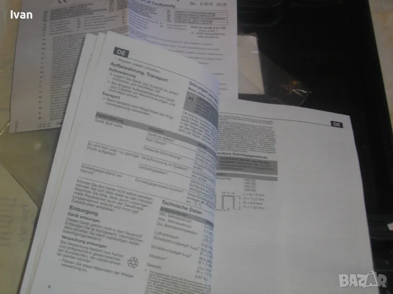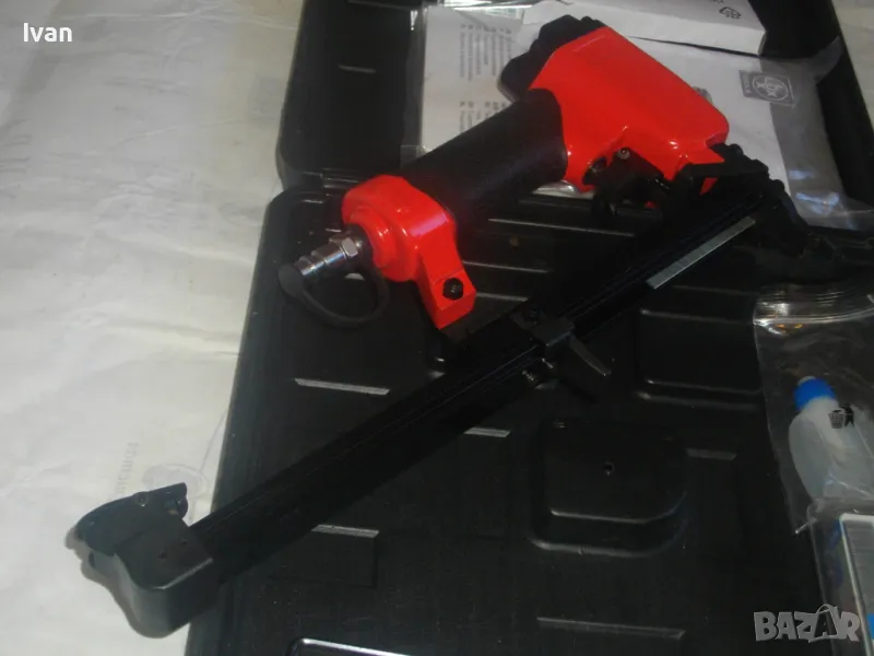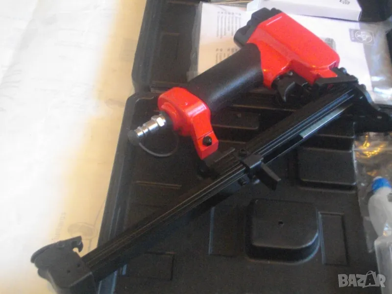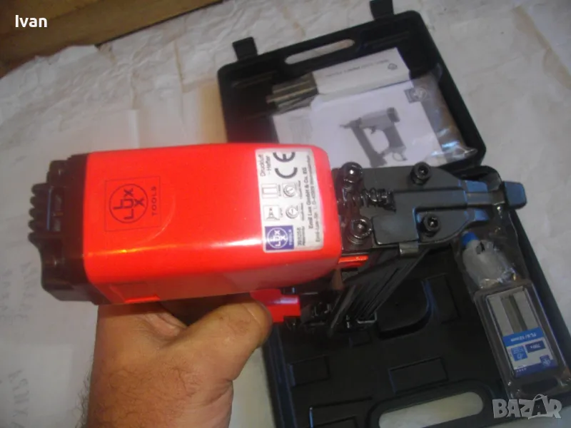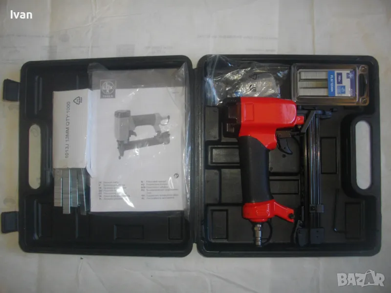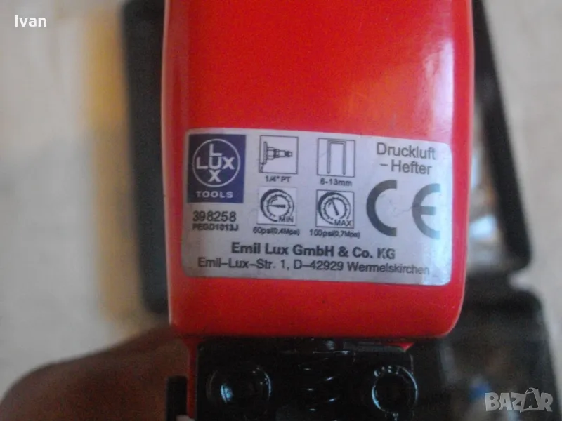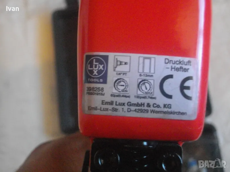 ОПИСАНИЕ на НОВ малък червен пневматичен такер - цена 159 лв. Марка LUX Tools.Оригинален немски, пълен комплект. За консумативи само скоби размери 6-16 мм дължина. Размери на такера 210 х 170 х 45 мм. Изключително лека и удобна за работа машина., включитено и при труднодостъпни места. Гумирано покритие на дръжката. Алумин корпус. Пълен комплект - оригинална машина, оригинален куфар, ключ шестостен за главата, масльонка а смазване, 1 кутия консуматив скоби оригинални немски на марката размер 12 мм дължина, втора пълна картонена кутия с много блистери скоби размер дължина 13 мм, оригинална немска книжка за модела машина с техн.характрестики и упътвания за експлоатация. Тегло само на машината - 1,0 кг. Тегло с куфара и консумативи - 1,9 кг. Цена 159 лв, твърда, без абсолютно никакъв коментар.