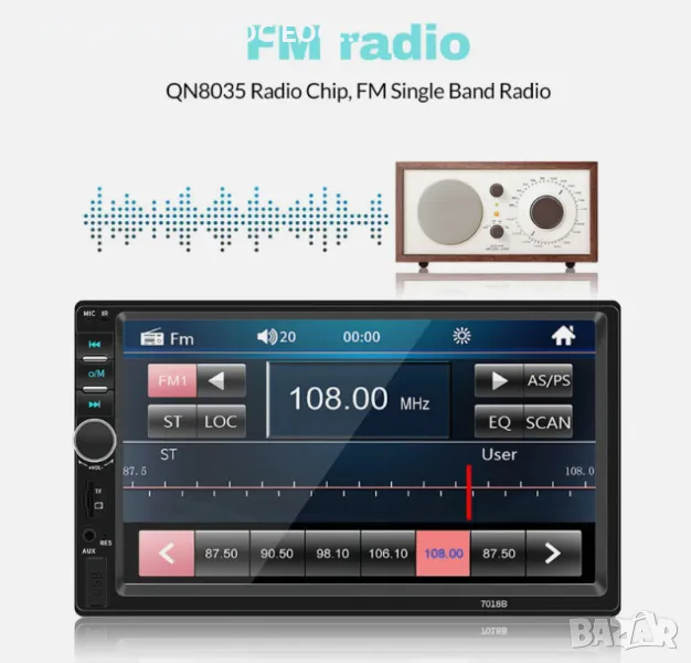 FM аудио функция с висока разделителна способност и 18 предварително зададени станции.