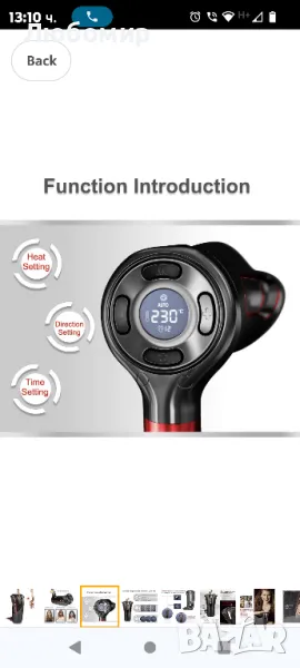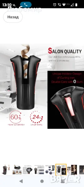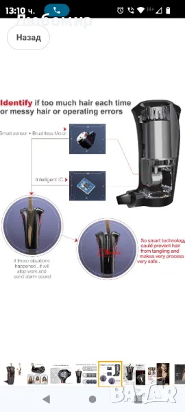 Функция за автоматично къдрене. Правата коса влиза, къдравата излиза. Косата се изтегля автоматично в машата с титаниево покритие, нежно се увива, държи и нагрява от всички посоки, за да се получи перфектна къдрица.Нов начин за интелигентно къдрене. Вграден интелигентен сензорен чип и прецизно контролиран безчетков мотор, той може да идентифицира дали има твърде много обем на косата за навиване за един път, разрошена коса или грешки при работа. Ако се случат тези ситуации, той незабавно ще спре работа, след което ще изпрати алармен звук и ще предотврати заплитането на косата. Ако косата е заседнала в машината, просто я отстранете с леко издърпване.Перфектно изживяване и ефект на къдрене. Оригиналният структурен дизайн прави косата по-равномерно и стабилно увита около нагревателната ютия, в резултат дефиницията на къдриците ще се увеличи с 60%, а формата на къдрене ще издържи цял ден. Уникален скрит дизайн на нагревателна преса, двойна грижа и "0" щети** 0,39 кг нетно тегло на продукта и изключително краткото време за нагряване правят процеса на оформяне на косата много лесен и бърз.Четири настройки на таймера (8/10/12/14 секунди): за различни вълни на косата и температура от 150°C до 230°C за различни типове коса. 8/10 S——леки къдрици. 12 S——меки къдрици. 14 S——силни къдрици. (ЗА СИГНАЛ, ЧЕ ВСЯКА ПРОДЪЛЖИТЕЛНОСТ Е ЗАВЪРШЕНА, ЩЕ ИМА ЗВУКОВ ДЕЙСТВИЕ) 150°C -190°C— деликатна, боядисана или увредена коса. 190°C - 210°C———нормална и здрава коса 210°C - 230°C——груба или естествена къдрава коса.