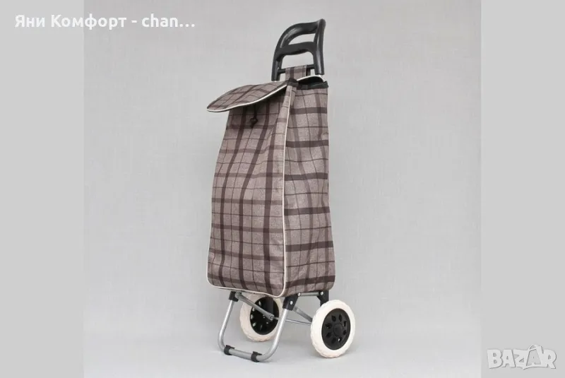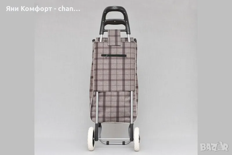 Пазарска количка 96 см. Налични цветове: сив и кафяв. Материал: текстил и метал- модерен дизайн- лека конструкция- метална рамка, сгъваема - торба от текстилен плат - джобче с цип на гърба- две колелаРазмер: чанта 32 х 58 х 19 височина на количката 96см