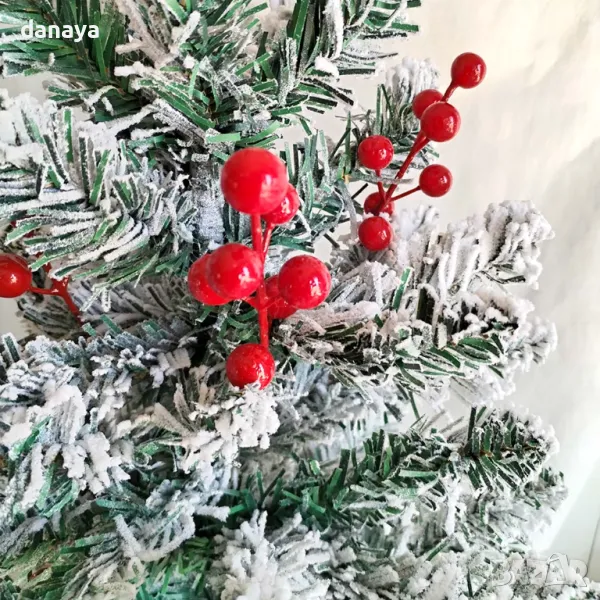 Клонките на елхичката са внимателно покрити с изкуствен сняг, който създава уютна зимна атмосфера. Декорацията с плодове на джел добавя допълнителен цвят и текстура, правейки всяка елхичка уникална.