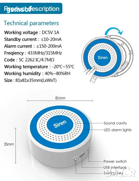 Безжичната сирена е съвместима с всички алармени панели използващи интеграцията на Tuya или Smartlife и работещи с аксесоари на 433Mhz. При повечето комплекти алармени системи, сирените са с кабел чиято дължина фабрично е не повече от 2-3 метра. Това обременява поставянето на сирената в близост до алармената система или удължаването на кабела й.