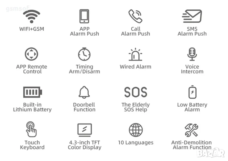 • 5 броя телефонни номера на които може да прави обаждане и/или да изпрати смс известие;