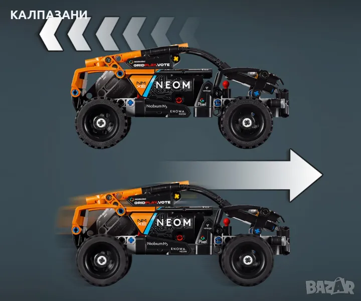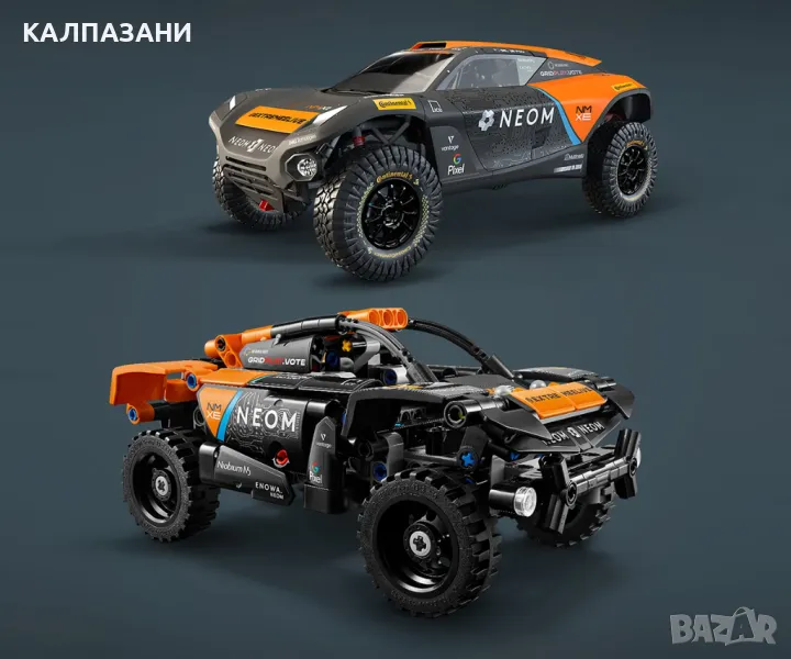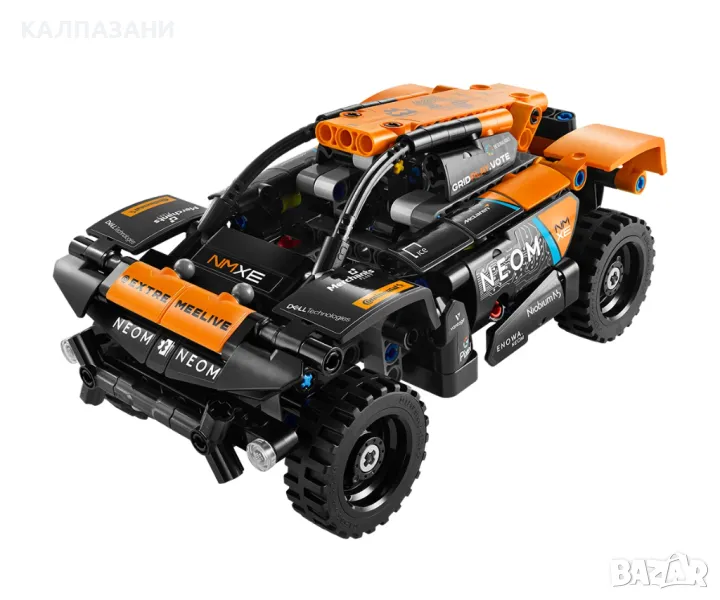 Готови ли сте за офроуд състезания? Състезателната кола NEOM McLaren Extreme E е проектирана да се състезава в някои от най-отдалечените райони на света. Сега можете да построите реплика от LEGO® Technic на невероятната офроуд кола и да видите какво може да прави. Разгледайте масивните гуми и използвайте функцията за издърпване назад, за да потеглите с висока скорост. Тогава си представете как празнувате на подиума, точно като истински пилот на Extreme E!