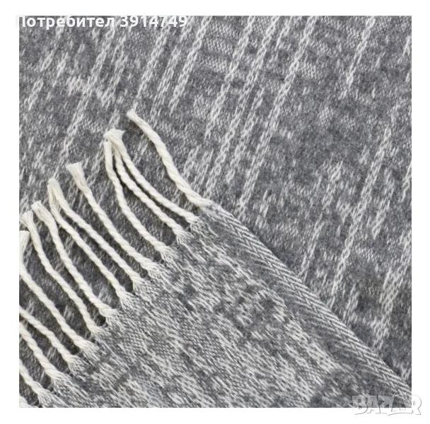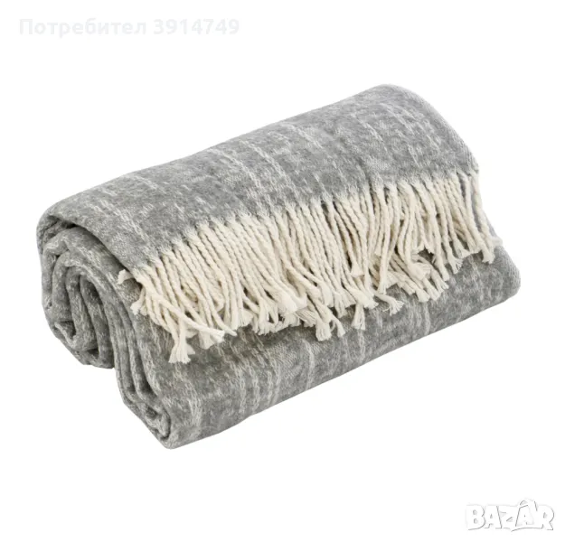 Висококачествена двойна плетка. Одеялото е меко, плътно и топло. 25% памук и 75% полиестер. С реснички. В сиво, прошарено с кремаво. Размерът е 130 см х 170 см. Произведено в Испания.