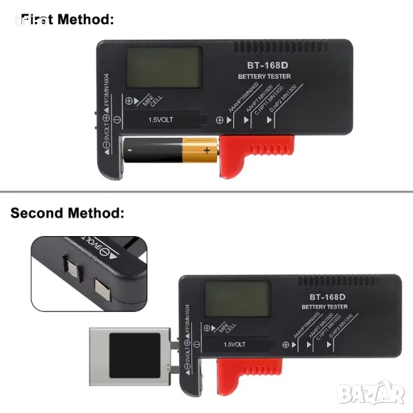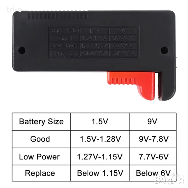 • Универсална проверка на батерията за повечето битови батерии. Проверете нивото на мощност на AA, AAA, C, D, 1,5 V, 9 V и миниатюрни клетки тип бутон.