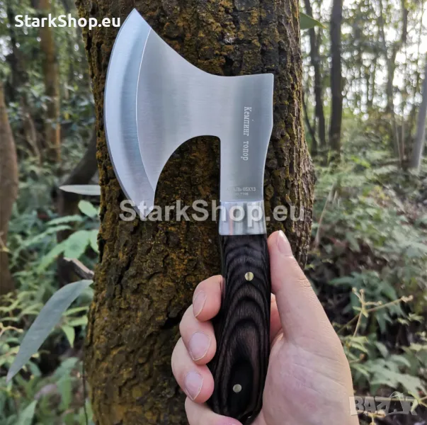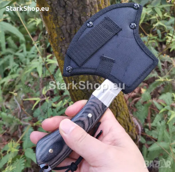 Малка брадва от неръждаема стомана, компактна, солидна и здрава. Много остро наточена стомана. Красива и много удобна компактна брадва, чудесна стомана, ергономична дръжка и дизайн. Чудесен инструмент за къмпинг, лов и туризъм.