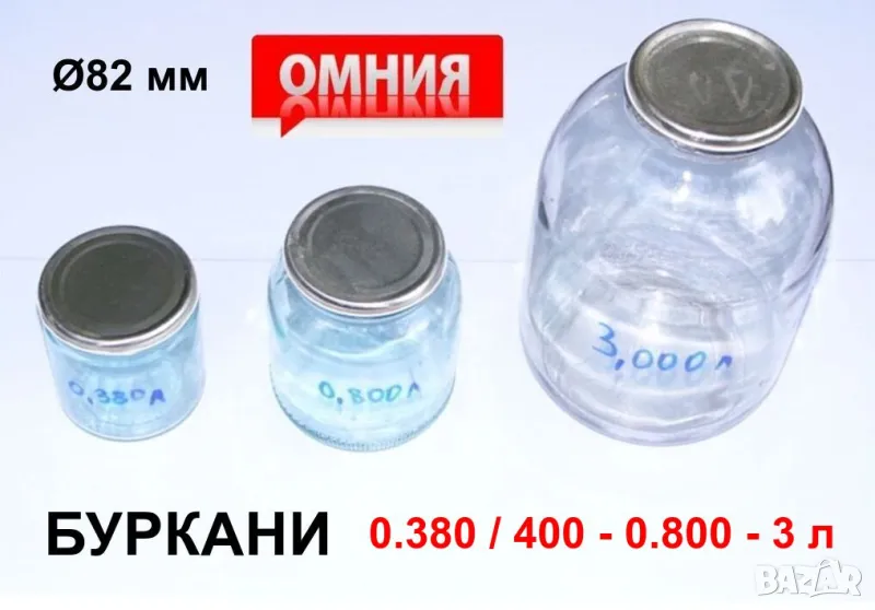 Налични и БУРКАНИ тип ОМНИЯ от 400 и 800 мл до 3 литра, ЗАТВАРАЧКА за бутилки тип КРОНЕНКОРК Ø26 и буркани тип ОМНИЯ Ø68 и Ø82, нови метални и пластмасови КАПАЧКИ, ЧЕТКА за миене, КАСИ Касети Касетки, БУРКАНИ на винт тип ТУИСТ-ОФ от 190 мл до 2,650 литра, БУТИЛКИ на винт, тип корона КРОНЕНКОРК и Шишета тип Широко гърло ( боза мляко ), ОТВАРАЧКА за бутилки / Тирбушон и консерви и др.(вижте обяви).