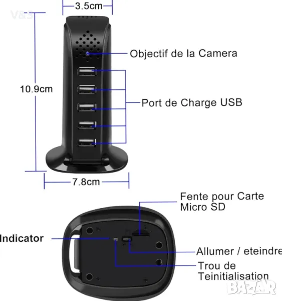 мини камера Wifi е идеалното решение за дискретно наблюдение на вашия дом или офис, денем или нощем. Оборудван с детектор за движение, той сигнализира всички движения на по-малко от 3 метра. В случай на проникване или подозрително движение систематично се изпраща известие до вашия смартфон. Осигурете вашето лично пространство, докато пътувате с това високотехнологично оборудване. Акцентът на тази шпионска камера е, че ви позволява да гледате онлайн на множество устройства. Съвместим е с iOS, Android и Windows. Тази функция ви позволява да държите дома си под око, независимо къде се намирате. Той ви дава качество на изображението, което отговаря на вашите очаквания, като предлага 1080P, 720P и 640P, с ъгъл на гледане от 100 градуса. Неговата функция за съхранение с карта с памет до 64 GB ви позволява незабавно да записвате изображения, заснети от приложението. В зависимост от вашите нужди можете също да ги запазите онлайн, като ги свържете към интернет. Насладете се на видеозапис в реално време, независимо дали за 24-часов, ускорен или цикличен запис. Шпионската камера разполага с 5 USB порта, които могат да се използват едновременно, което служи за бързо зареждане. Можете да използвате шпионското зарядно 110V-240V. Окомплектована е с контакт и захранващ кабел. За улесняване на изпълнението е предоставено ръководство с инструкции.