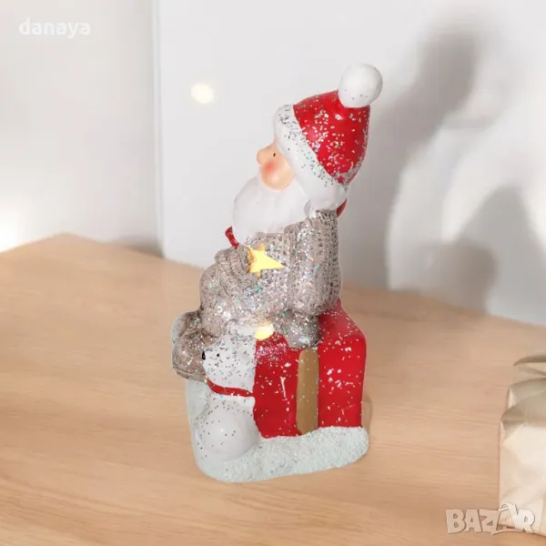 Светеща коледна украса. Светеща керамична фигура Дядо Коледа с куче, 15 см височина. Перфектен акцент за вашата коледна украса. Покрита с блестящи брокатени частици, тази красива фигурка свети в мека жълта светлина, създавайки топла и уютна атмосфера. Фигурата работи с 3 LR44 батерии, включени в комплекта, което ви позволява да я използвате веднага. Добавете празничен блясък към своя дом с тази уникална декорация, идеална за всяко помещение.