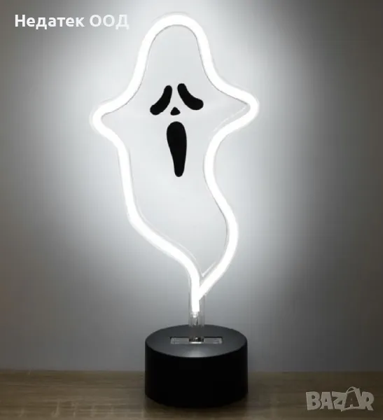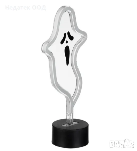 Хелоуин декорация 3V, 0.06W, във формата на малък призрак с неонова led тръба по периметъра с висок интензитет на светлина и дълъг живот. С режим на статична светлина и бял цвят ще допълни по най-добрия начин вашата декорация за Хелоуин. Работи с 3 AA батерии (не са включени).