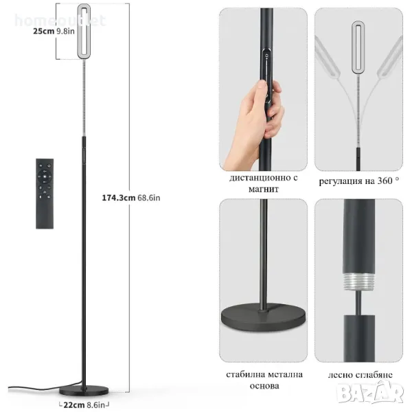 Тази подова лампа LED 12 W предлага 4 цветни степени-3000 K/4000 K/5000 K/6000 K и непрекъснато затъмняване (5%-100%).
