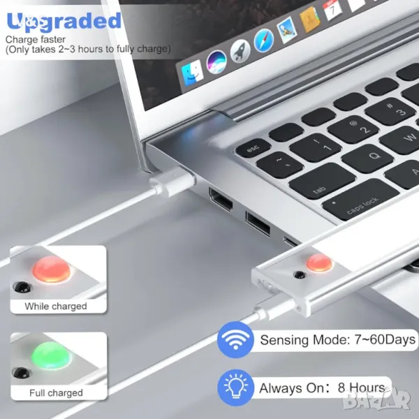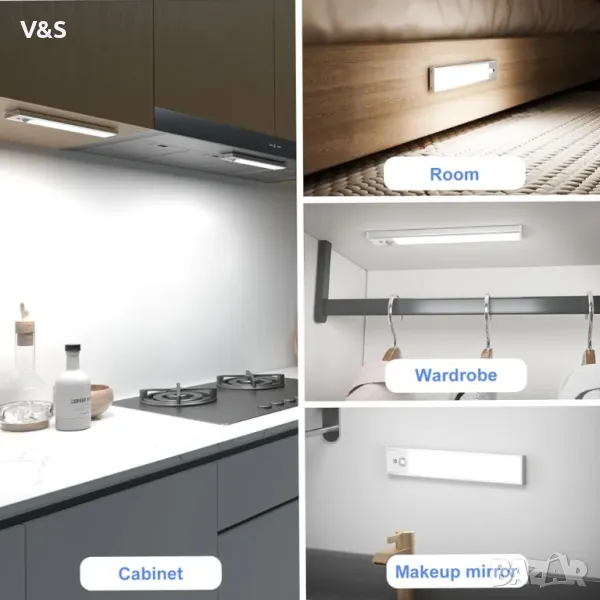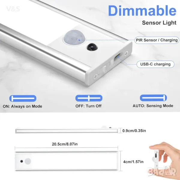 Сензор с висока чувствителност: Когато LED светлината под шкафа е настроена на режим на автоматично разпознаване, тя ще се включи незабавно, когато открие обект, който се движи в рамките на 3 метра/100°; Когато LED светлината под шкафа не открие движение в рамките на 20 секунди, тя ще се изключи, за да пести енергия. За да пести енергия, той не се включва, когато има достатъчно дневна светлина.