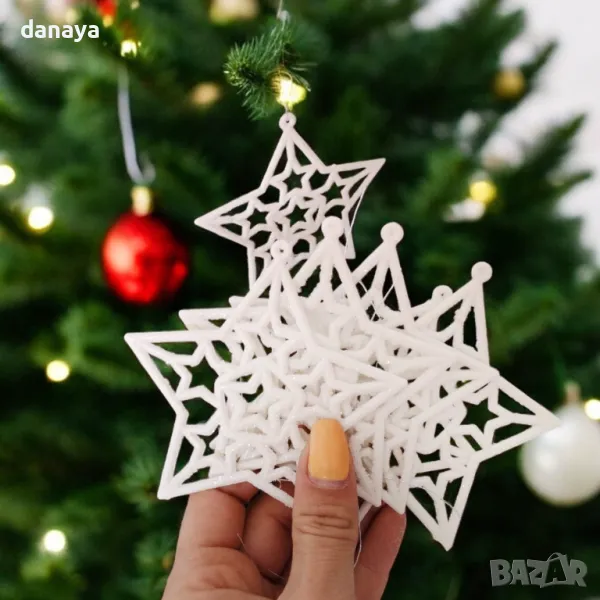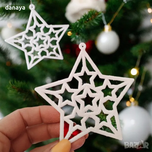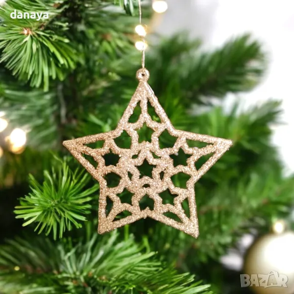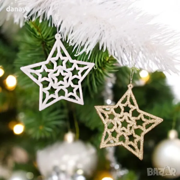 Комплект от 6 броя бели или златисти брокатени звезди с връвки за закачане. Стоят много ефектно на елхата или като допълнение към гирлянди. Изработени от PVC материал, покрити с брокат.