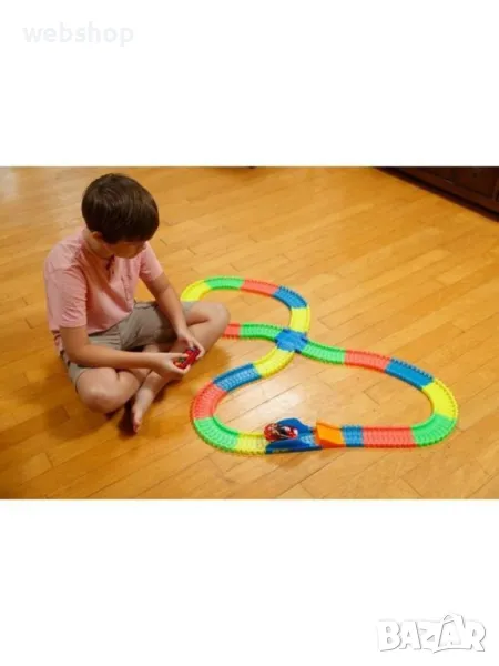 - Комплектът включва: светеща червена състезателна кола с 5 LED светлини, 240 части светеща писта, стартова врата, светеща финална врата, (4) конуса, магически писти, забавно ръководство и лист с 132 стикери за кола Peel N' Stick