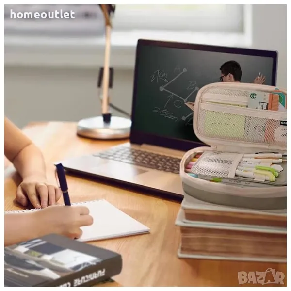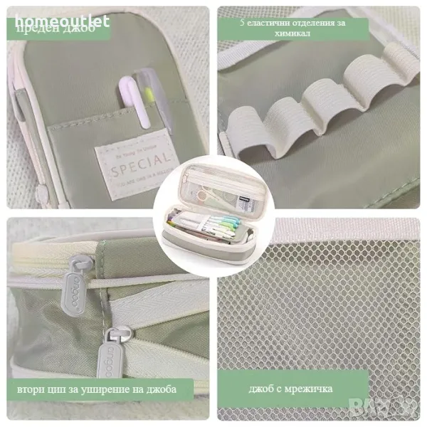 Може да съхранява до 50 химикалки или молива и малки канцеларски материали в мрежестата чанта, като гума, стикери и др.