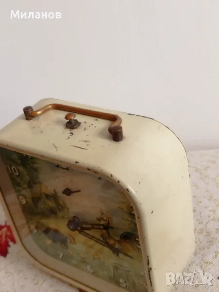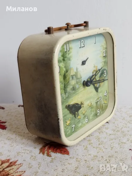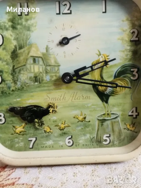 Стар механичен анимиран будилник Smith Alarm, работи и звъни.Много стар, от 40-50- те години на миналия век.Кокошката кълве зрънца.Размери-100 х 104 милиметра.Номер на часовника 2380979.Наличен и същия, кръгъл