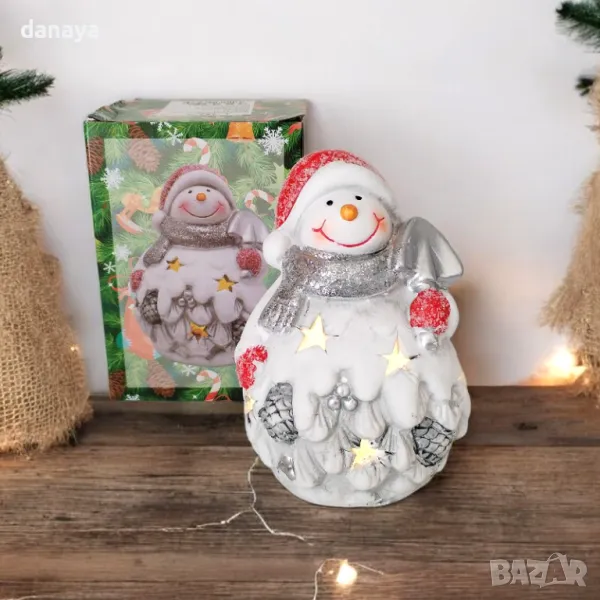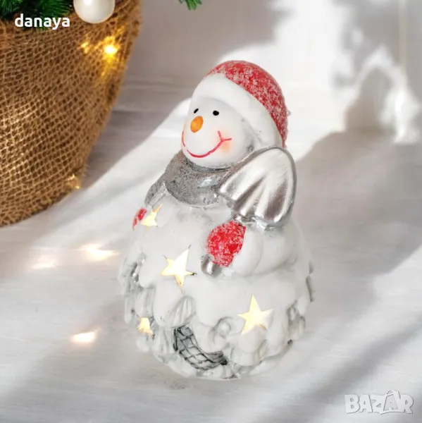Светеща коледна украса. Светеща керамична фигура Снежен човек, който държи сребриста лопатка, 13 см височина. Перфектен акцент за вашата коледна украса. Керамична коледна фигурка, светеща в мека жълта светлина, създава топла и уютна атмосфера. Фигурата работи с 3 LR44 батерии, включени в комплекта, което ви позволява да я използвате веднага. Добавете празничен блясък към своя дом с тази уникална коледна декорация, идеална за всяко помещение. предлага се в кутия. Подходяща за коледен подарък. Материал: керамика