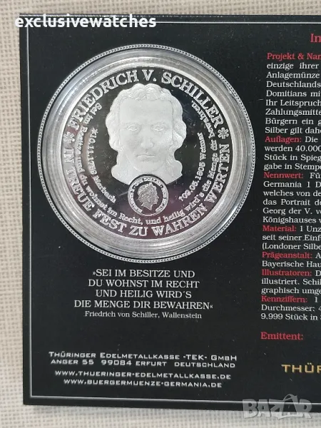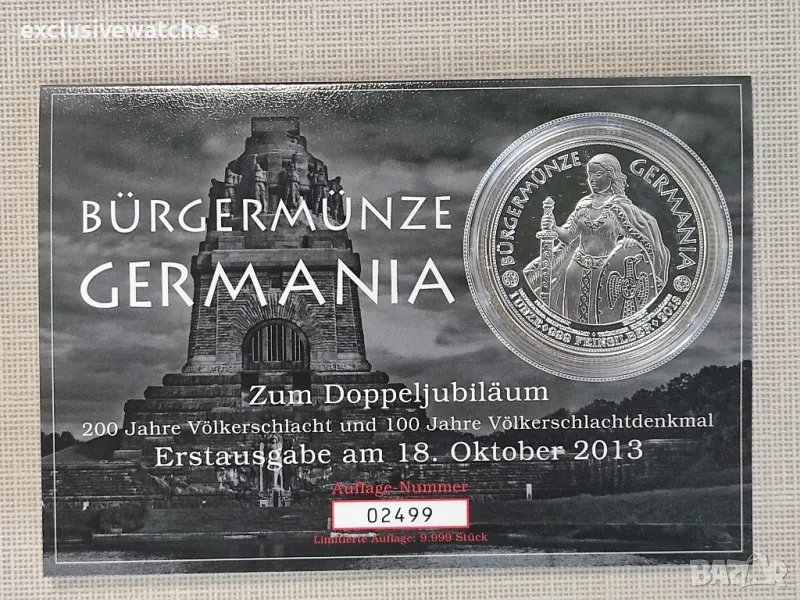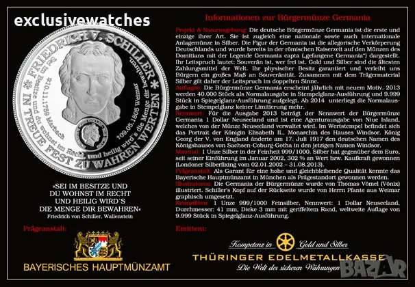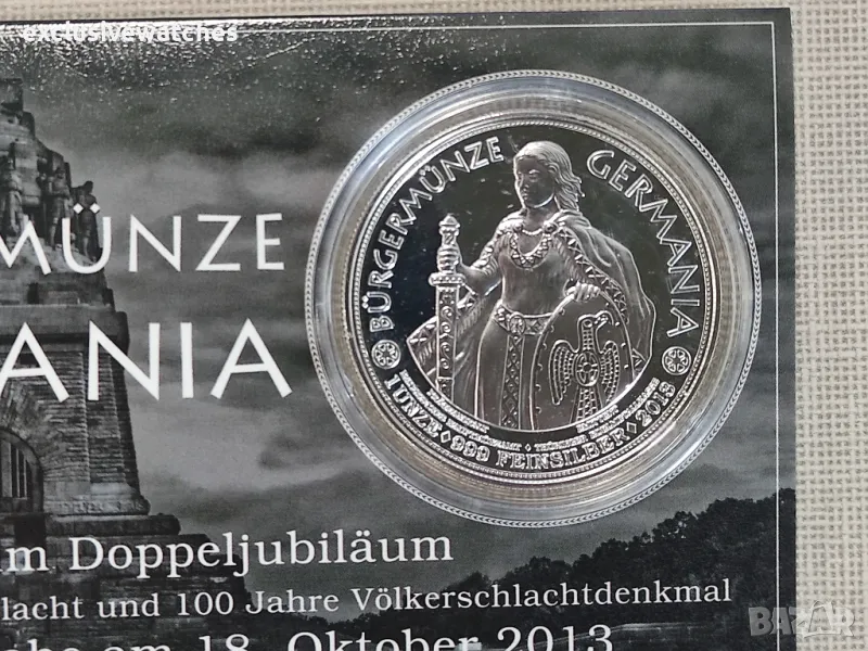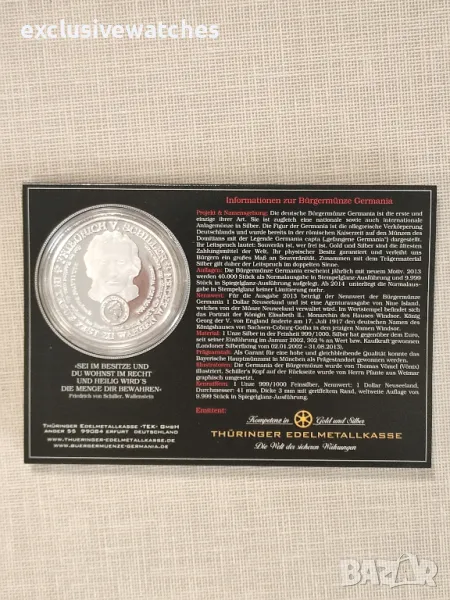 Проект и именуване: Немската гражданска монета Germania е първата и единствена по рода си. Това е национална и международна сребърна монета. Фигурата на Германия е алегоричното въплъщение на Германия и вече е изобразена в Римската империя върху монетите на Домициан с легендата Germania capta (”Ережена германия”). Техният девиз е: суверен е този, който е свободен. Номинална стойност: За изданието от 2013 г. номиналната стойност на Civic Coin Germania е 1 Dollar New Zealand и е издание на Niue Island, което се управлява от новозеландската монета. Портретът на кралица Елизабет II, монарх на къщата на Уиндзор, е портрет на менюто. Крал Джордж V на Англия се сменя на 17-ти. През юли 1917 г. немското име на кралското семейство на Саксония-бурга-Гота в сегашното име Уиндзор. Илюстратори: ”Германия на Гражданската монета” е илюстрирана от Томас Вемел (Ваникс). Главата на Шилер по гърба е направена графично от г-н Пфанте от Ваймар. Първо издание: 18. Октомври 2013 г. на двойната годишнина от 200-годишнината от битката при нациите и 100 години от битката при нациите.