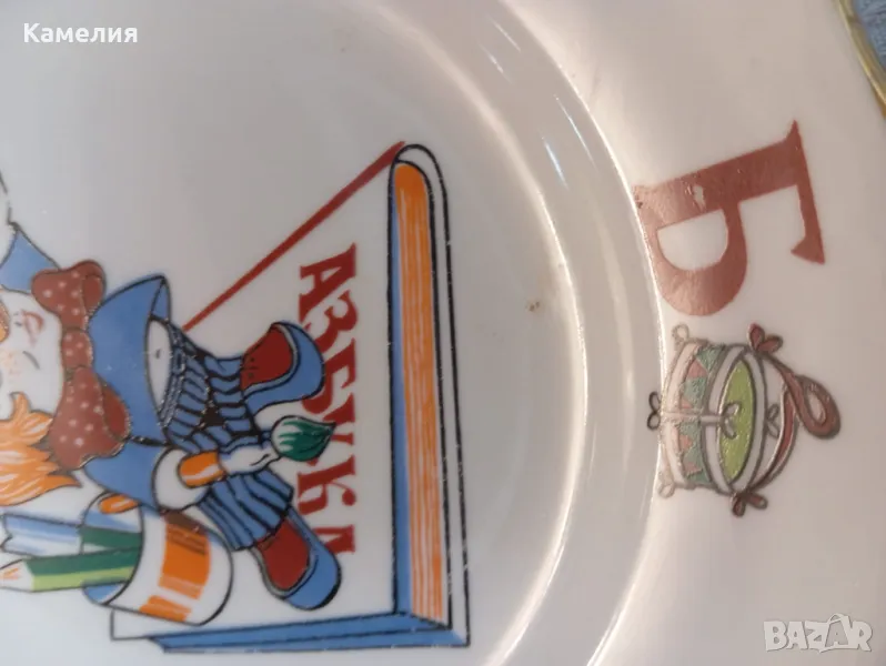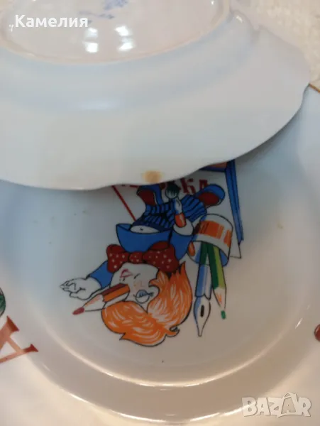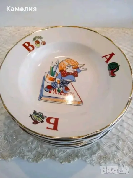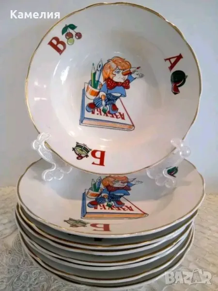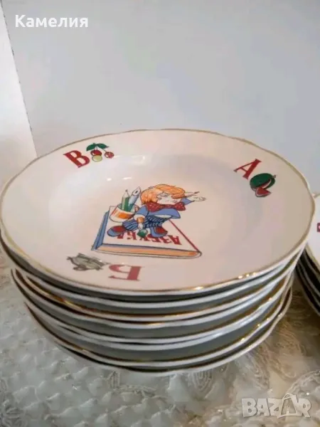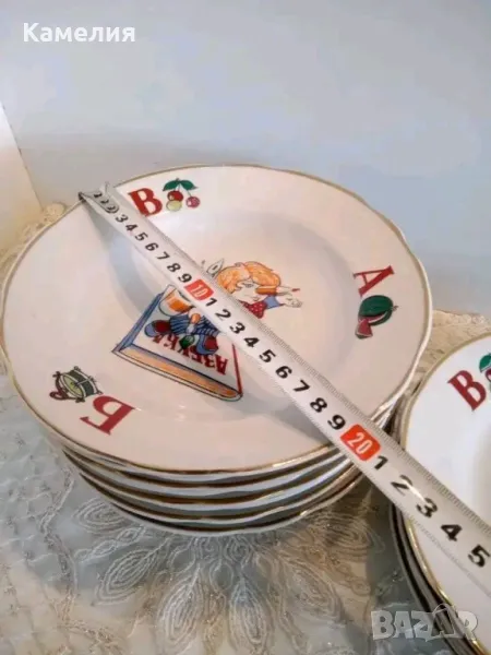 Рядъки детски чинии Азбука. Коростенски ( СССР). Не са ползвани. Налични 3 броя дълбоки чинии с червен печат 20 см, без забележки. Налични 3 броя плитки син печат 20 см с фабрични забележки. ( две плитки с малки точици, една с петно отзад.). 25 лв една чиния.
